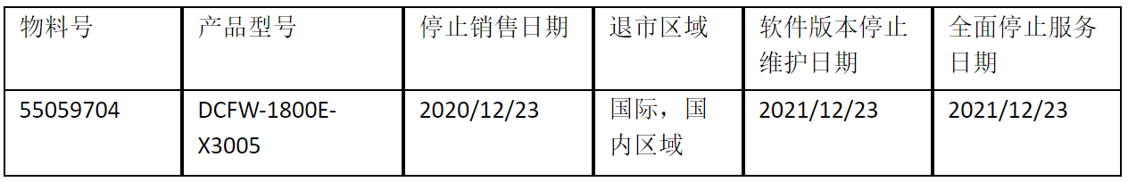 北京神州数码PA集团中国官网信息技术有限公司正式通知您, 以上DCFW-1800E-X3005下一代防火墙(55059704)将于2020年12月23号停止接收新的订单(具体日期见上表),不再供货。给您带来的不便,敬请原谅。