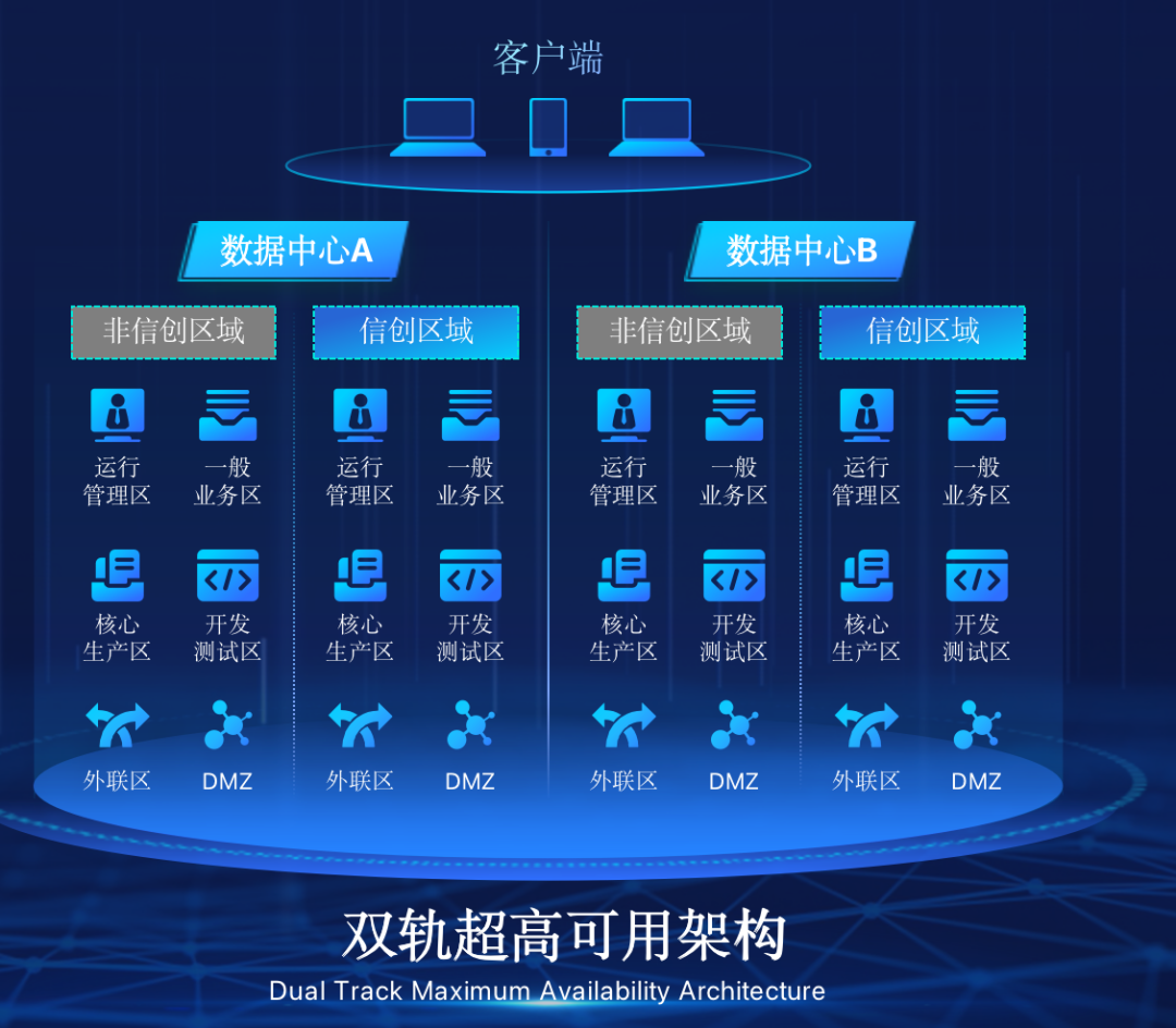 PA集团中国官网在企业面临自主创新IT基础重构过程中,推出的全新架构双轨超高可用架构(简称DTMAA),在双活数据中心的分区调度基础上,添加每个数据中心内信创域和非信创域的分域调度,来实现分区分域协同的多活双轨超高可用。